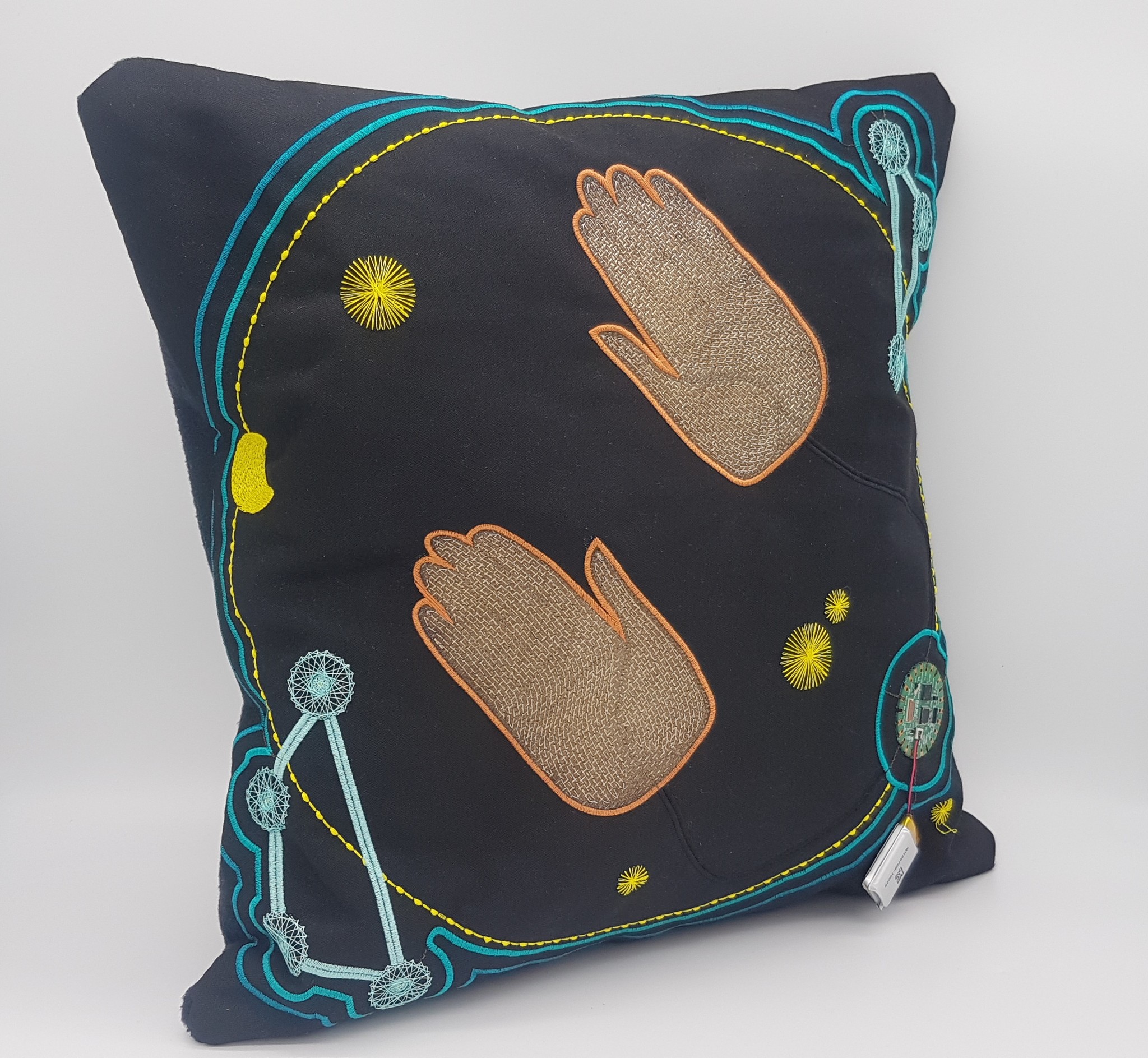 Zwei handförmige Berührungsflächen, die als Applikation mit leitfähigem Textil realisiert sind, dienen als kapazitive Touch-Sensoren. Sieben ZSK LED-Pailletten bilden zwei LED-Cluster, die entsprechend dem berührten Sensor blinken.