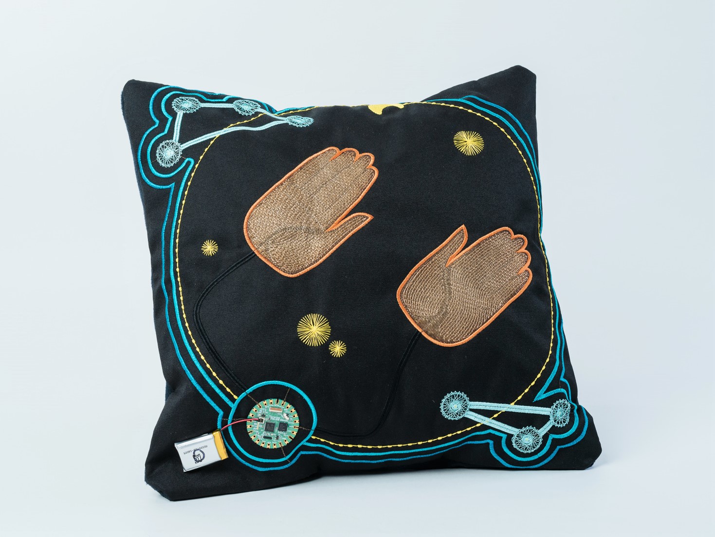 Unser Smart Pillow ist ein interaktives Kissen mit zwei LED-Clustern, die bei Berührung blinken.