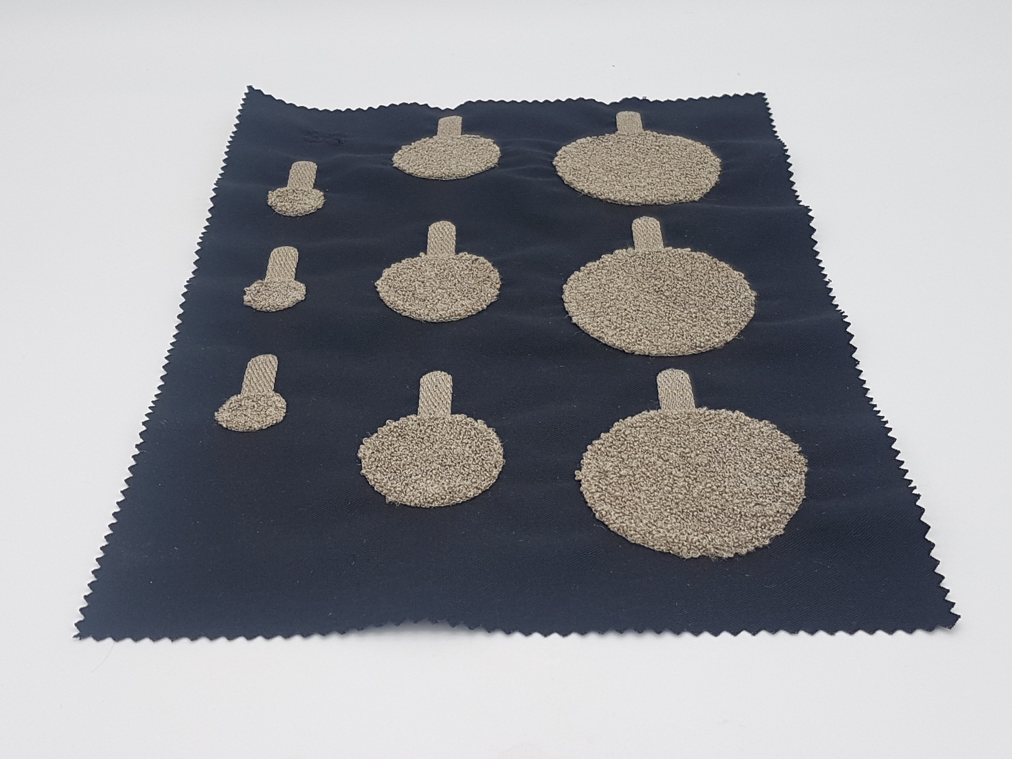 Dieses Entwicklungskit enthält 9 moosgestickte Elektroden in drei verschiedenen Größen. Damit können Sie die Elektroden und deren Funktion bei bestimmten Anwendungen schnell und zuverlässig testen. Jede Elektrode verfügt zusätzlich über eine gestickte Fläche, um den Anschluss an Ihre Elektronik zu erleichtern, z.B. mittels leitfähiger Druckknöpfe.