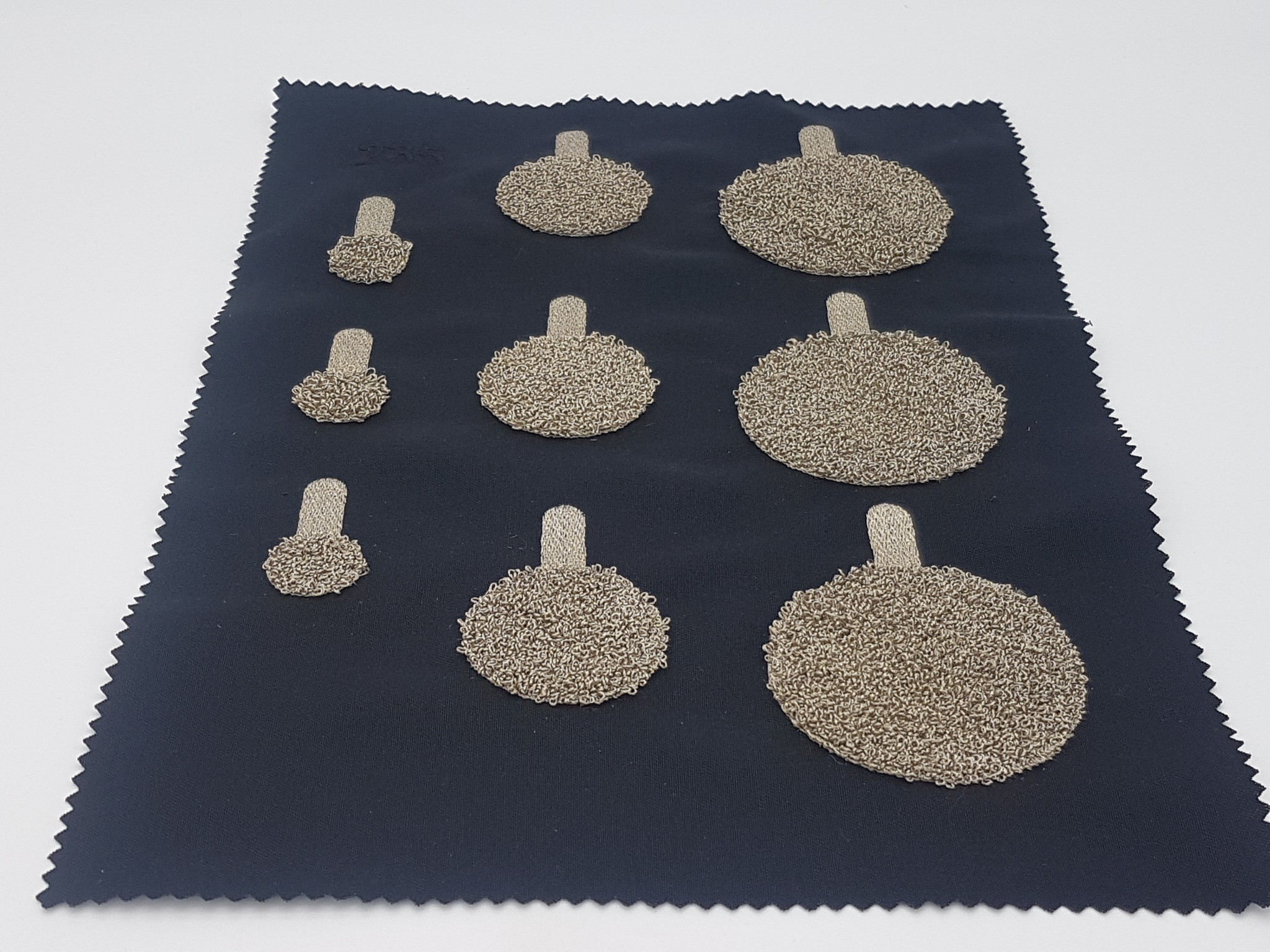 Dieses Entwicklungskit enthält 9 moosgestickte Elektroden in drei verschiedenen Größen. Damit können Sie die Elektroden und deren Funktion bei bestimmten Anwendungen schnell und zuverlässig testen. Jede Elektrode verfügt zusätzlich über eine gestickte Fläche, um den Anschluss an Ihre Elektronik leichter zu machen, z.B. mittels leitfähiger Druckknöpfe.